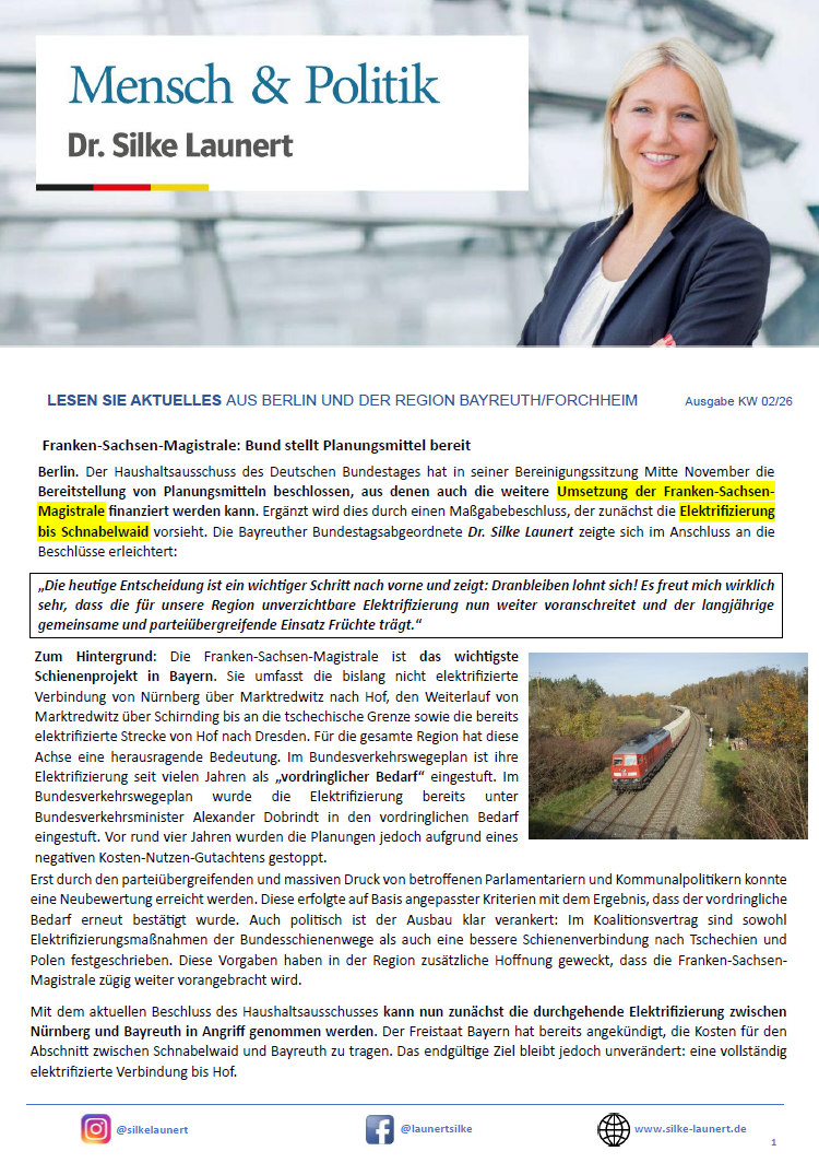 Berlin. Der Haushaltsausschuss des Deutschen Bundestages hat in seiner Bereinigungssitzung einen Maßgabebeschluss zum Ausbau der Franken-Sachsen-Magistrale gefasst. Damit erteilt er den Planungsauftrag für die Elektrifizierung