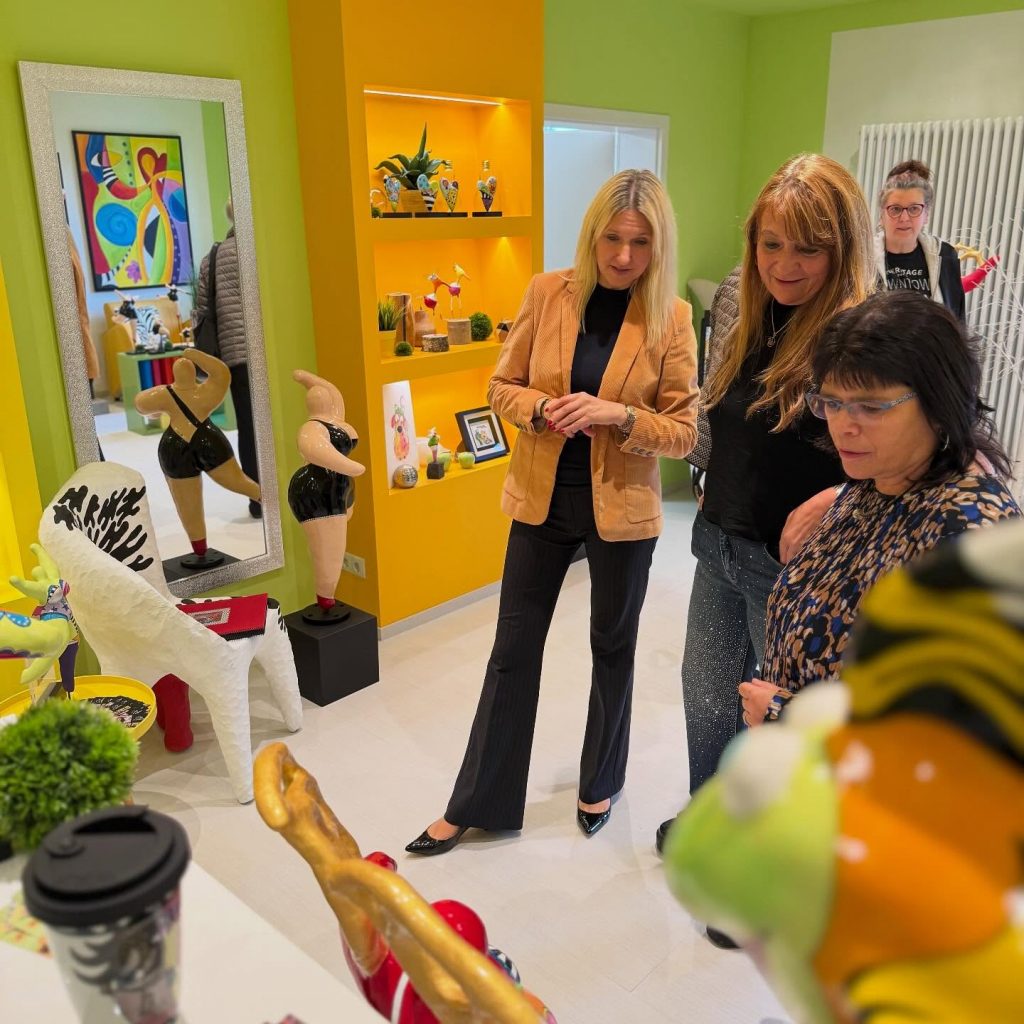 Bayreuth. Im Januar besuchte Bundestagsabgeordnete Dr. Silke Launert das Unternehmen Bechert Haustechnik GmbH von Erich Goldhammer und lernte dabei auch seine Frau Anja Goldhammer kennen. Schon damals zeigte sie sich begeistert von deren Kunstwerken und nahm sich vor, eines Tages gemeinsam mit der Frauen Union einen Besuch abzustatten. Fast ein Dreivierteljahr später war es nun so weit: Die Frauen Union Bayreuth-Stadt besuchte das Atelier von Anja Goldhammer in Bayreuth. Dort entstehen ihre farbenfrohen Kunstwerke, Figuren, Mosaikarbeiten und Gemälde. Die Besucherinnen zeigten sich beeindruckt von den Arbeiten und Silke Launert bedankte sich herzlich bei der Künstlerin für die Möglichkeit des Besuchs: „Vielen lieben Dank für deinen herzlichen und warmen Empfang. Wir kommen immer gerne zu dir!“